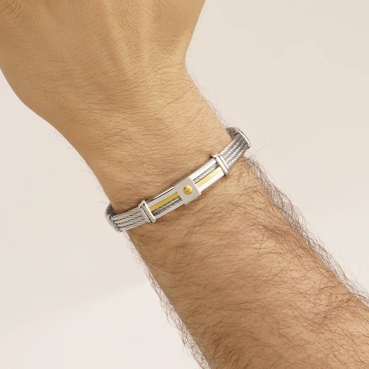 Avec sa lannière en câbles multi-rangs et son motif or et acier inoxydable, le bracelet NORMA vous inscrit au club très fermé des poignets distingués. Un bijou homme au look very trendy.