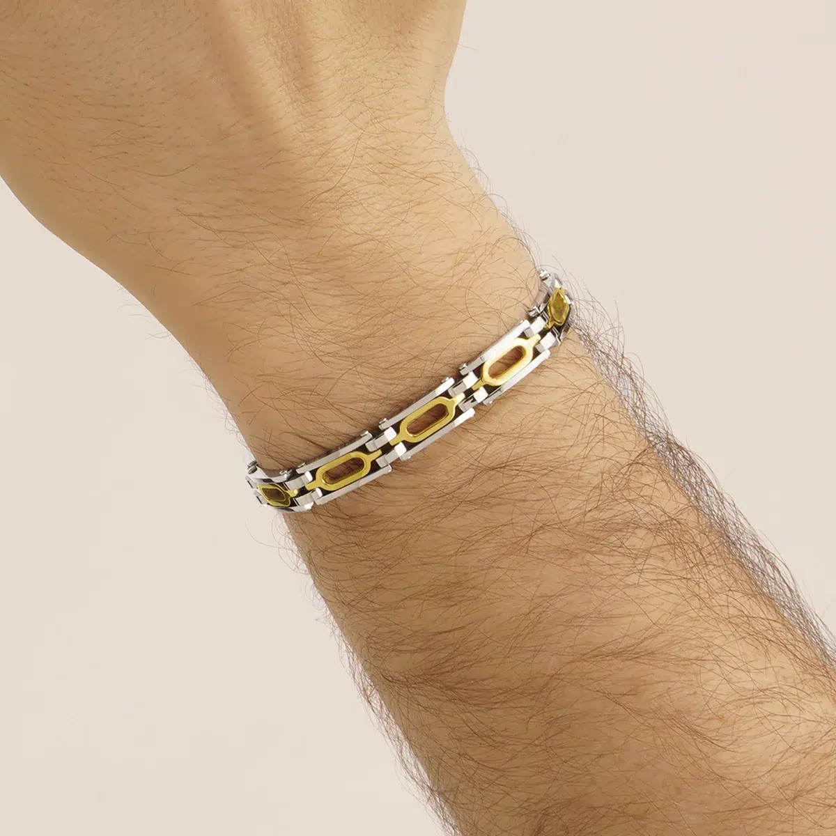 Le ciel est sans limites ? Votre style n’en a pas non plus avec le bracelet APOLLO. Visez les étoiles en portant ce bijou homme en acier bicolore à maillons larges façon chaîne de moto. Mise à taille possible avec maillon ajustable.