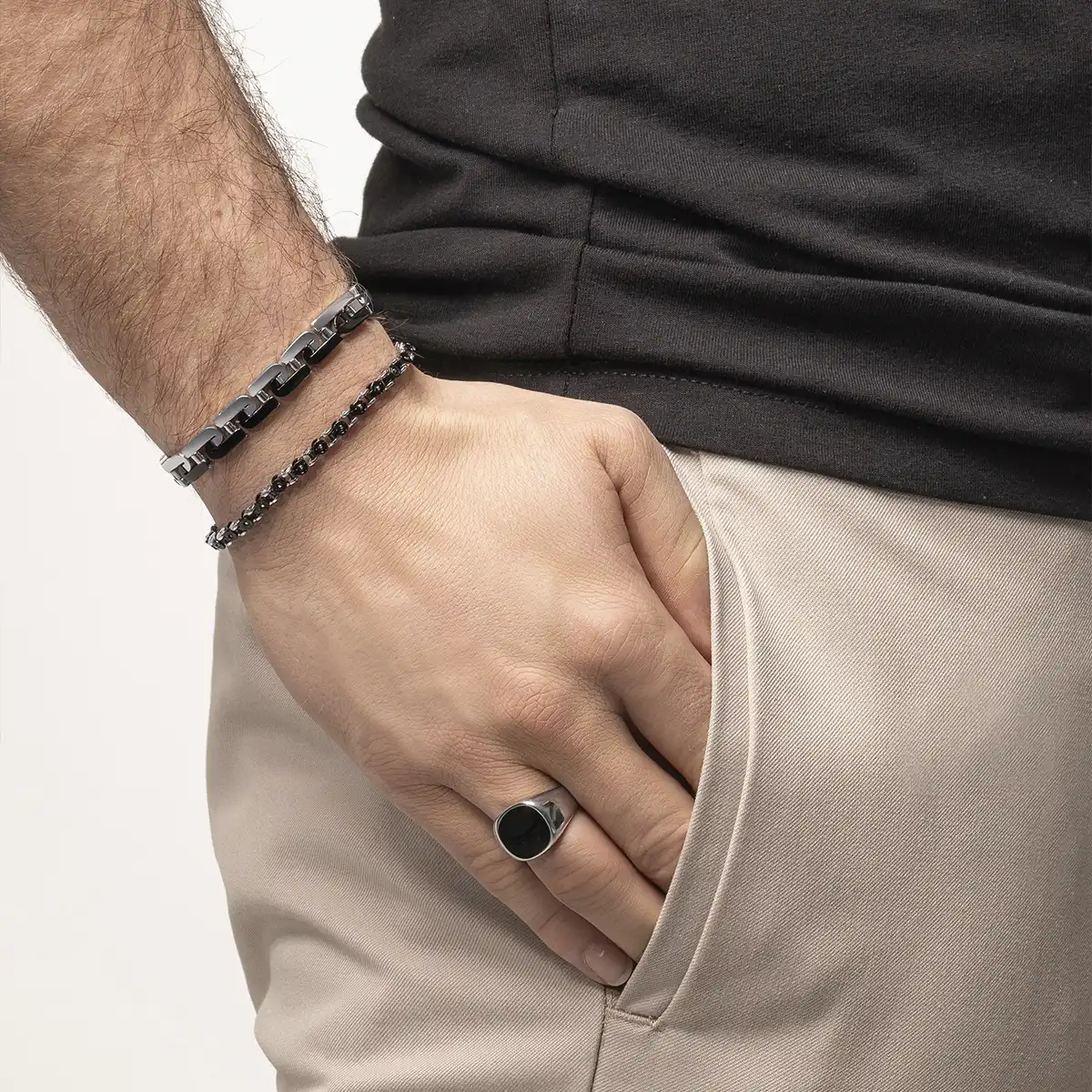 Design minimal, charme infernal pour le bracelet homme ADHÈS : signez un pacte faustien avec votre vestiaire, en portant ce bijou en maillons d’acier bicolore blanc et noir.