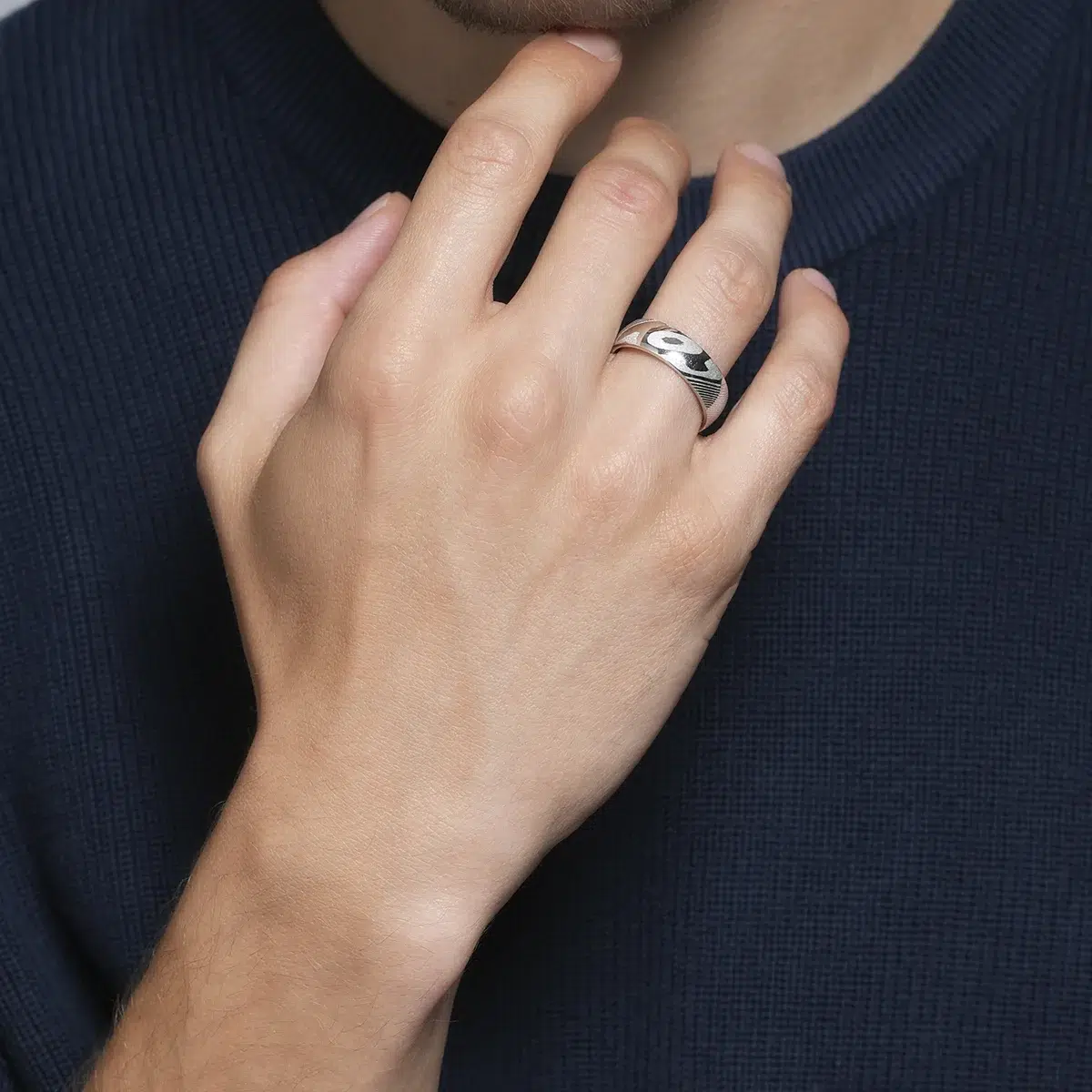 Son anneau au design épuré se distingue par un subtil effet damassé, qui offre un jeu de textures unique et raffiné, évoquant à la fois la robustesse et l’artisanat traditionnel.