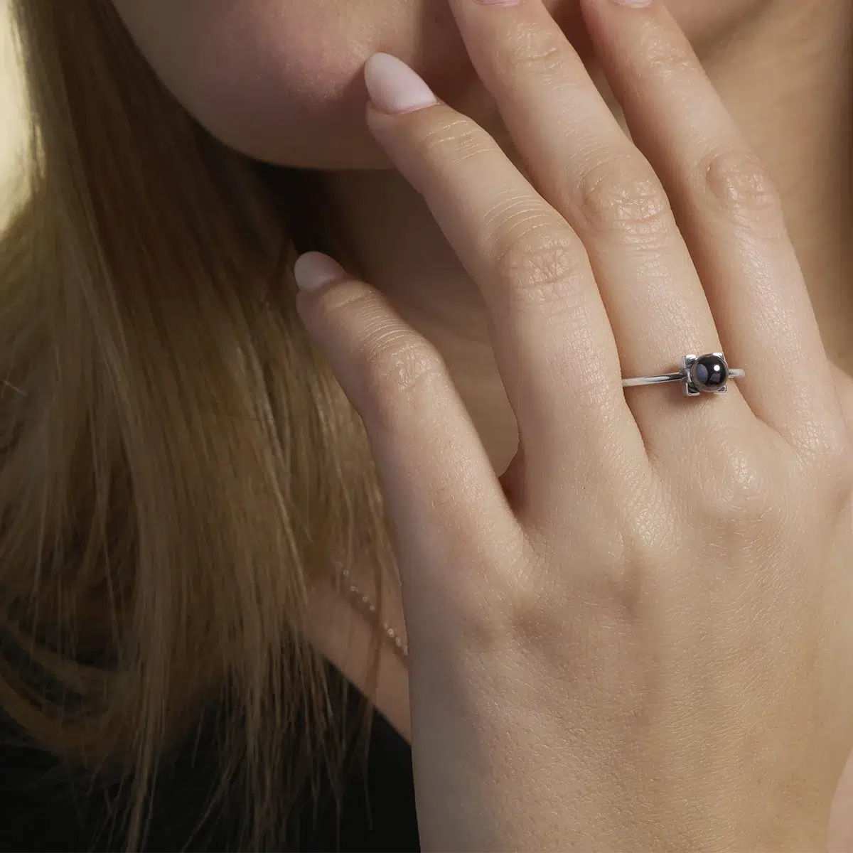 La Bague DONI en argent 925 et perle d’hématite noire revisite l’élégance minimaliste avec une touche architecturale. Son anneau fin supporte une perle d’hématite noire, mise en valeur par un carré d’argent aux angles apparents, créant un contraste harmonieux entre douceur et rigueur.