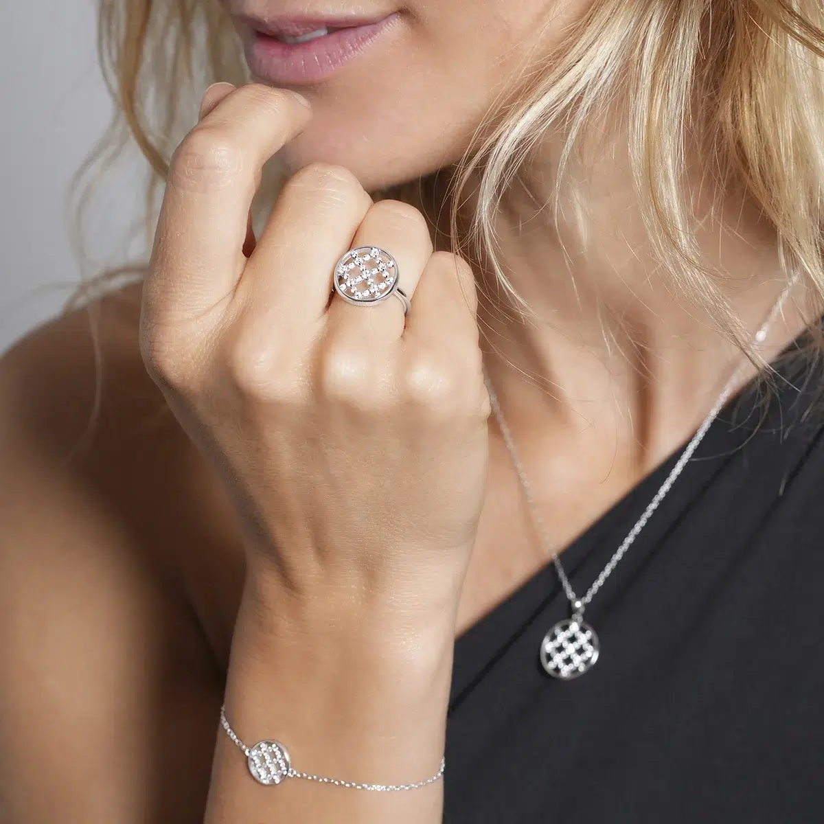 Ornez votre main d’une touche d’éclat raffinée avec la Bague ISÉE de JOURDAN Bijoux. Confectionnée en argent 925, cette bague se distingue par son motif central délicatement ajouré et quadrillé de lignes scintillantes d’oxydes de zirconium. Ce design laisse deviner la peau en dessous pour une allure à la fois moderne et sensuelle.