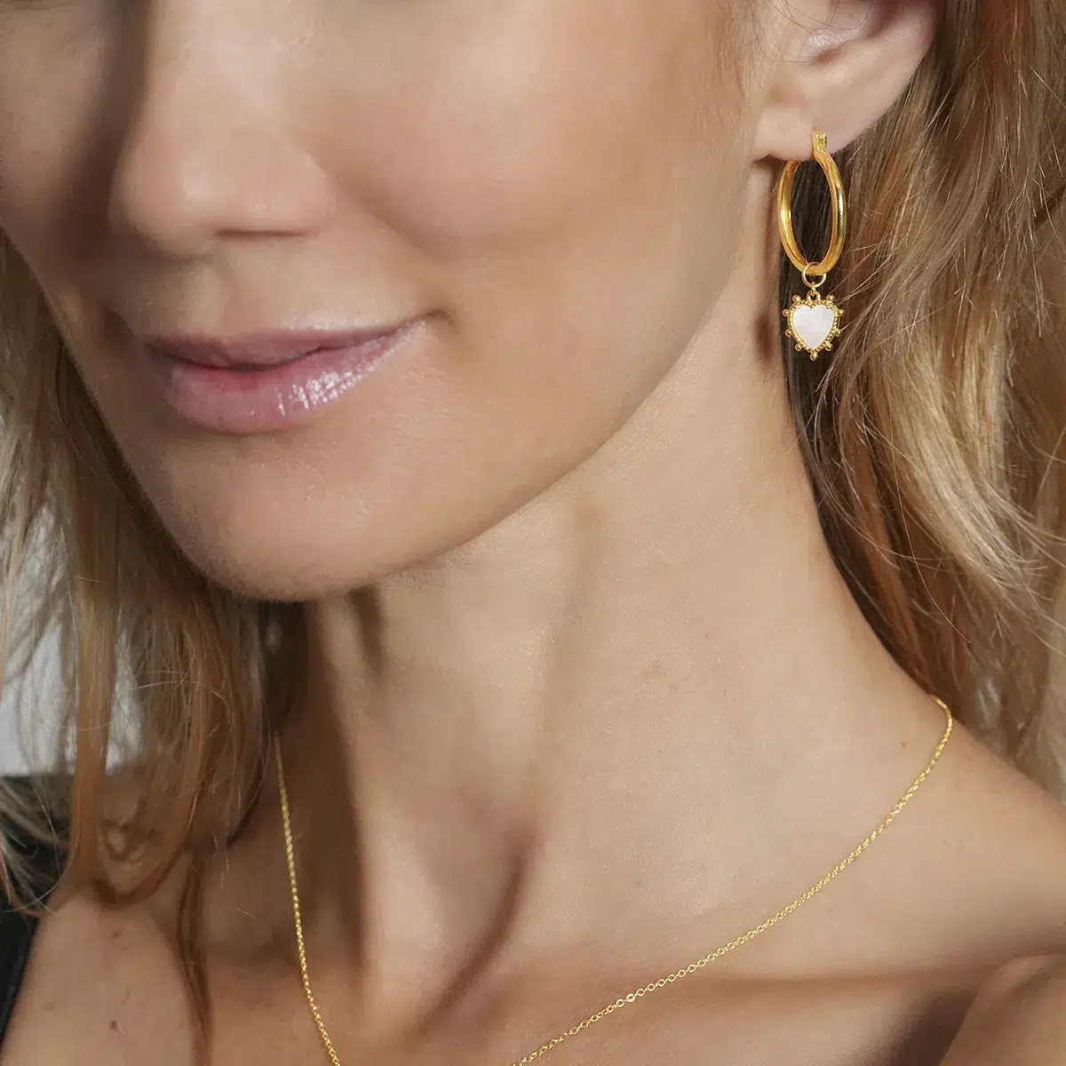 Affirmez vos liens avec les Boucles d’Oreilles NOLA en argent 925 doré, de délicates créoles agrémentées d’un pendentif cœur en nacre blanche. Ce motif, symbole d’attachement et d’affection, se balance avec légèreté pour accompagner vos mouvements.