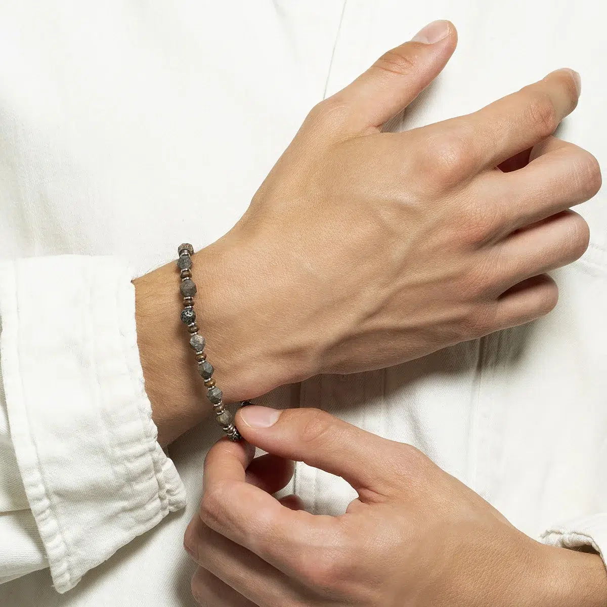 Affirmez votre présence avec le bracelet ADEM, une création masculine aux nuances minérales intenses. Ce bijou élastique alterne perles d’ilménite aux reflets sombres, bronzite aux accents cuivrés et éléments en acier finement travaillés. L’ensemble forme un équilibre subtil entre élégance brute et sophistication naturelle.