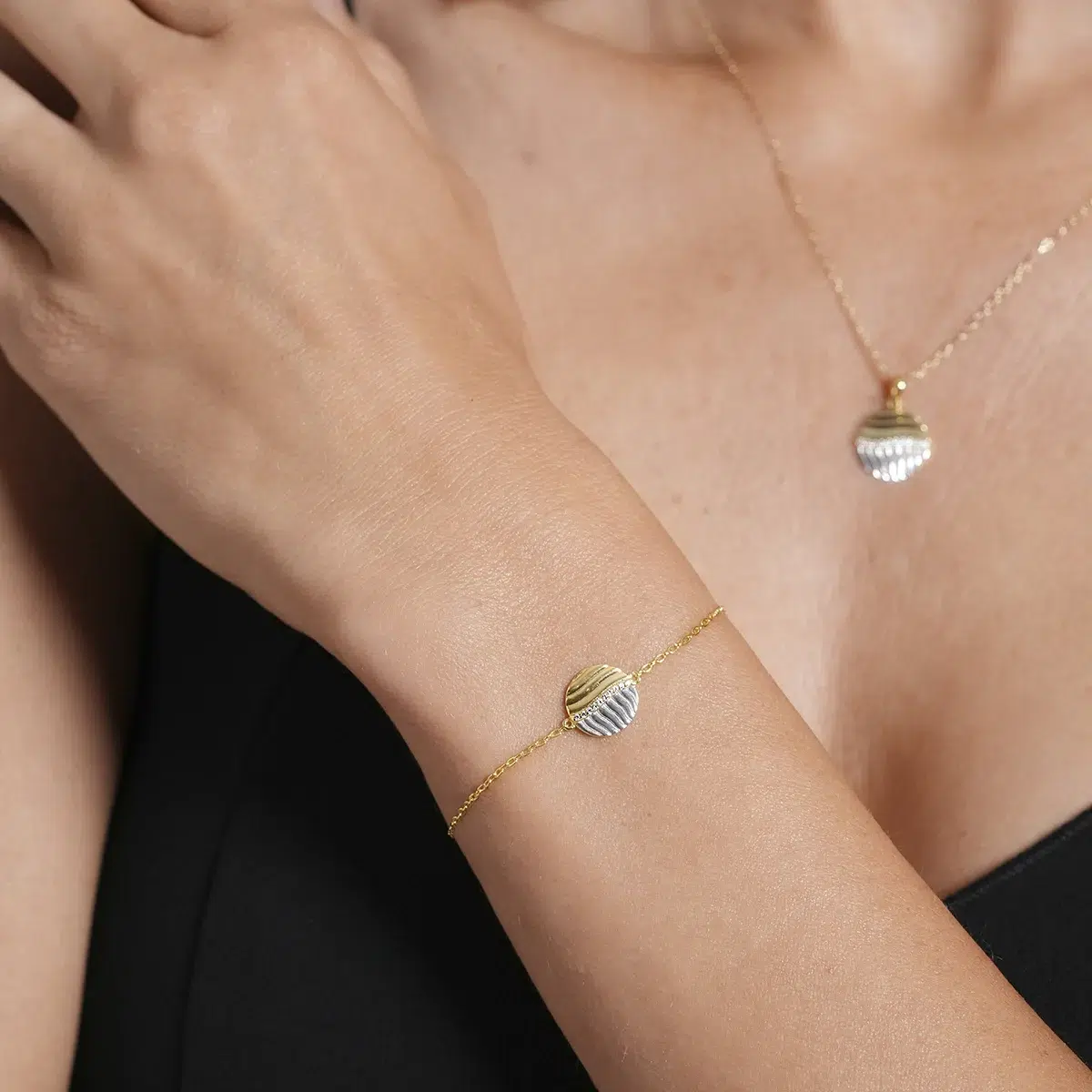 Le Bracelet DIANE en argent 925 bicolore révèle un équilibre subtil entre nuances dorées et argentées, pour une esthétique à la fois moderne et élégante. Son motif, rythmé par des textures contrastées, incarne avec finesse l’harmonie des opposés.