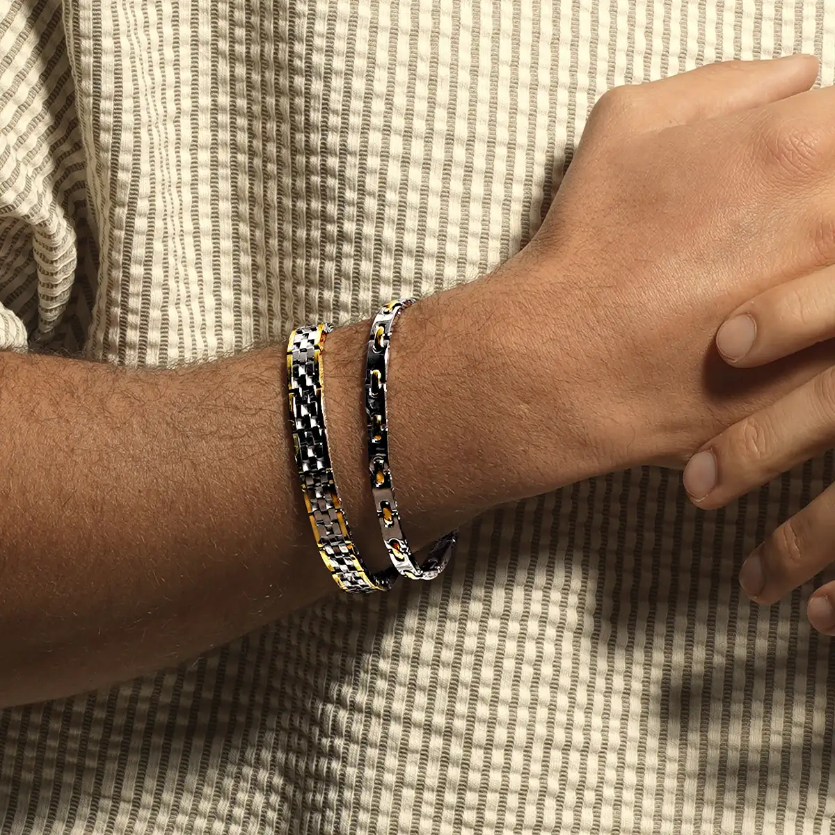 Vous aimez vous démarquer ? Vous aimerez porter le bracelet DINEMA, avec maillons en acier et charnières en acier noir. Un bijou homme au look contrasté pour forte personnalité. Existe aussi en acier et acier noir.