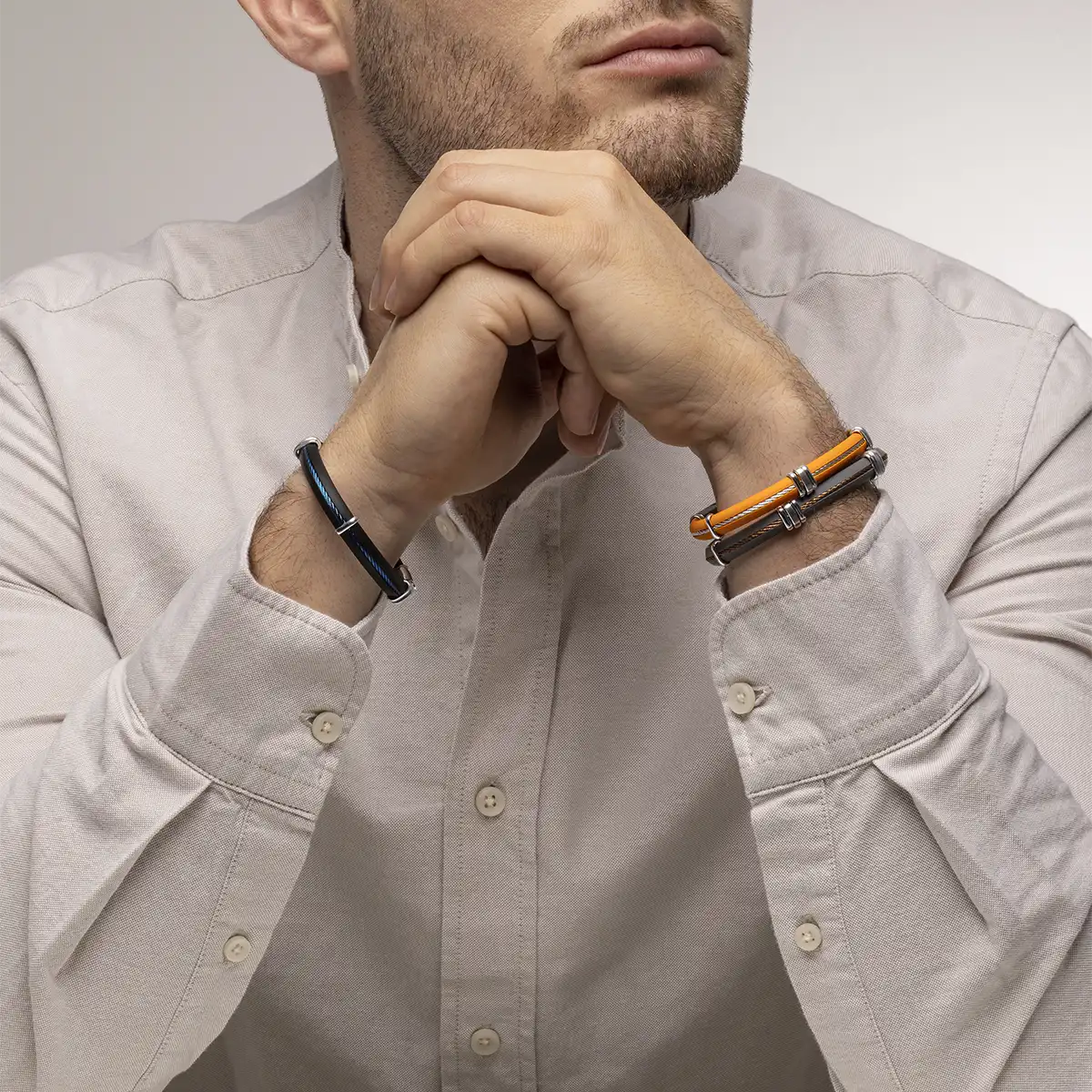 Une bride en caoutchouc orange avec câble contrasté, quelques anneaux d’acier, un look serein et décontracté À n’en pas douter, le bracelet homme FARO fera les beaux jours de votre style. Qu’attendez-vous pour en faire l’accessoire de vos échappées belles ? Un bijou de poignet masculin livré avec maillon ajustable. Existe en noir/rouge/marron et gris