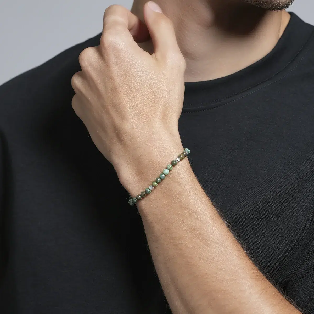 Le bracelet HALO en turquoise africaine dévoile une palette de verts profonds, ponctuée de nuances terreuses, pour une allure à la fois naturelle et affirmée. Chaque perle, minutieusement sélectionnée, est rythmée par des détails en acier inoxydable, apportant une touche de contraste moderne à cette composition minérale.