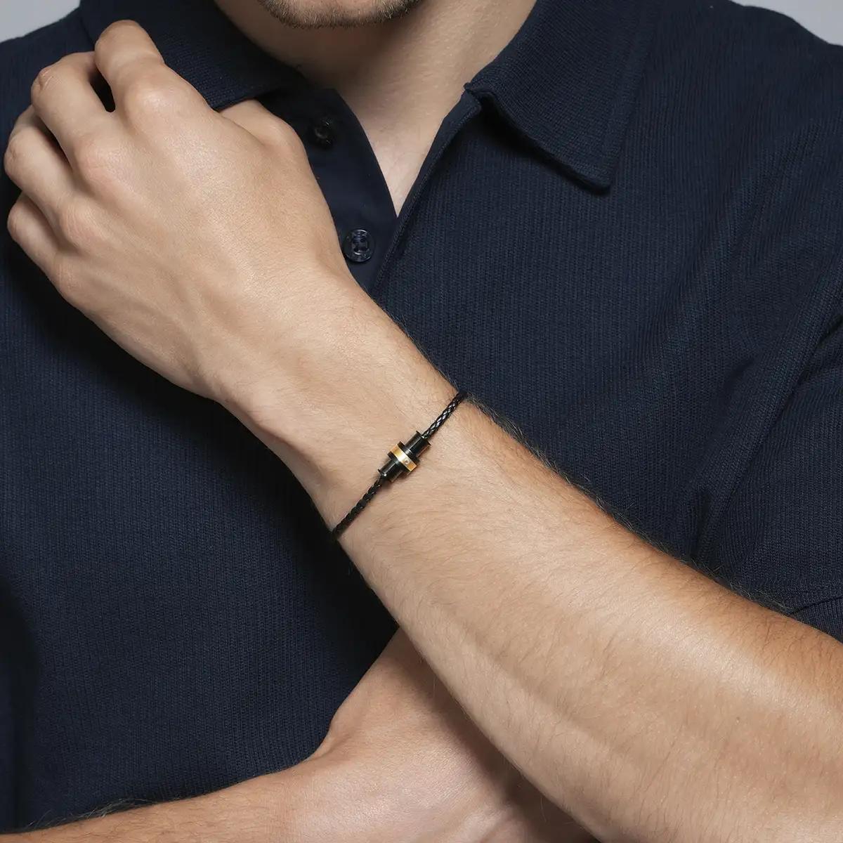 Son cuir fin tressé noir s’accompagne d’un décor en acier noir orné d’une touche dorée, pour un contraste raffiné et résolument contemporain. Chaque détail est pensé pour incarner force et élégance, à l’image de l’homme qui le porte.