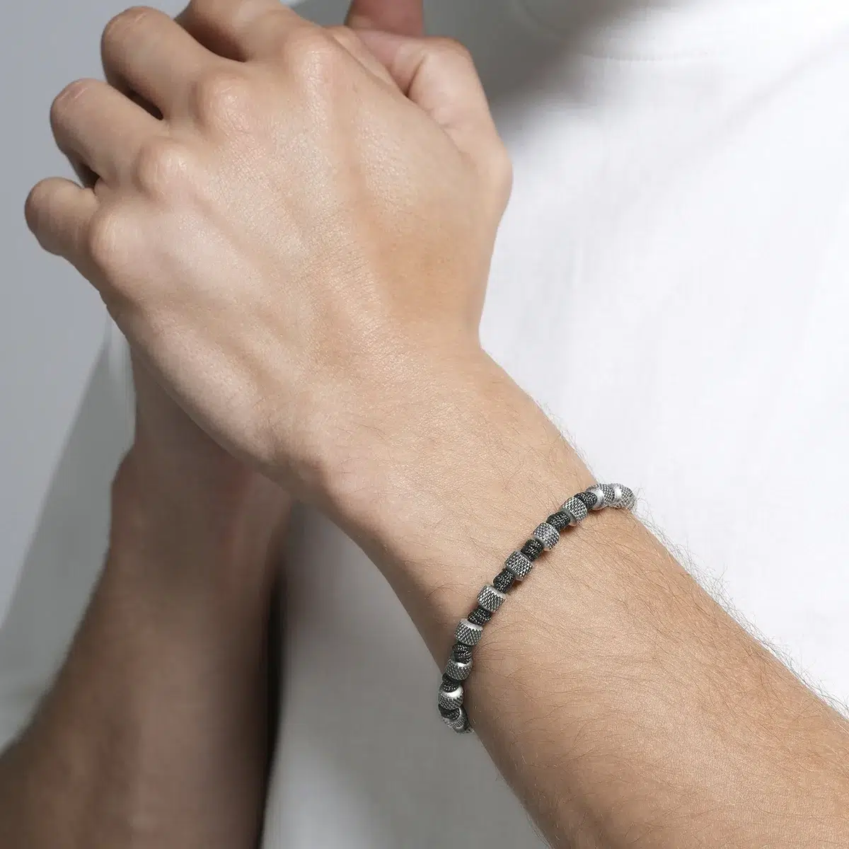 Jouez la carte de la sobriété contemporaine avec le bracelet IRON, une pièce masculine qui marie force et discrétion. Son cordon tressé s’alterne harmonieusement avec des perles en acier PVD noir, pour un rendu graphique et texturé. Le fermoir, également en PVD noir, complète le tout avec élégance et assure un maintien sûr au poignet. Léger et facile à porter, le bracelet IRON est pensé pour les hommes en quête d’un bijou au design sobre, mais qui ne passe pas inaperçu.