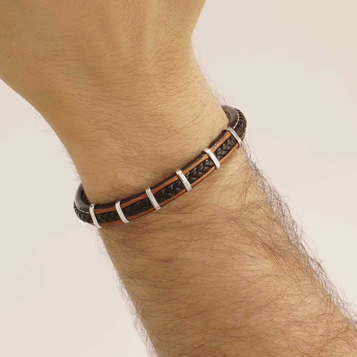 Le bracelet KESSEL incarne tout le savoir-faire de Jourdan : une lannière en cuir tressé à piqûre sellier et bandes contrastées, jalonnée d’anneaux en acier inoxydable. Un bijou homme au design subtil, avec fermoir magnétique.