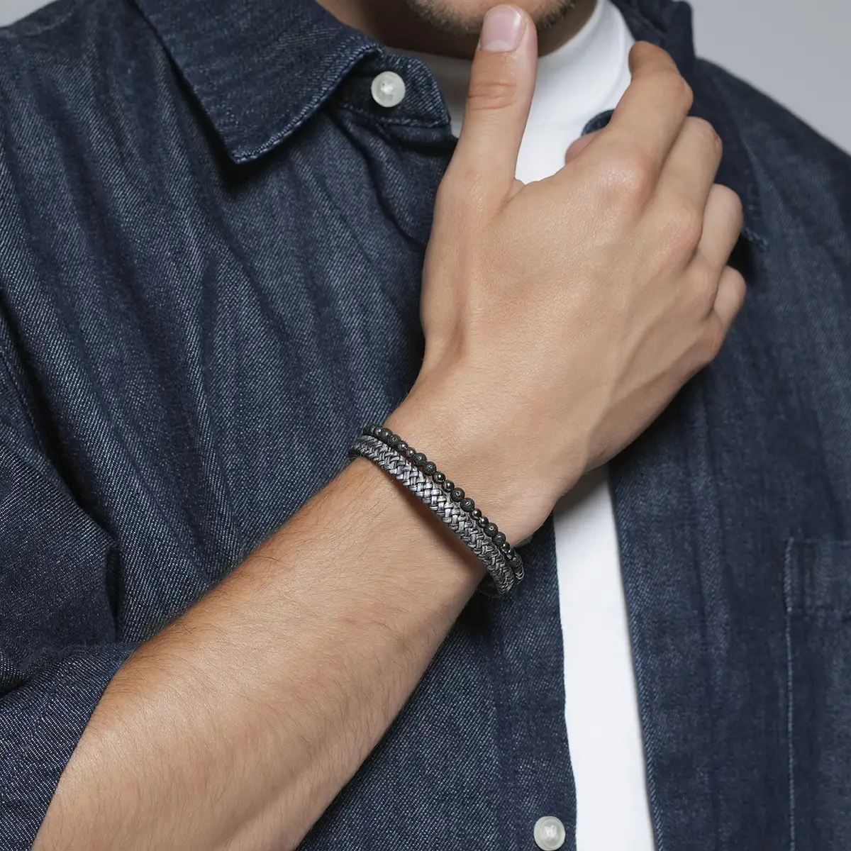 Ce modèle à deux brins associe un cuir gris, au toucher souple et texturé, à un rang de perles naturelles mêlant hématite et pierres de lave à l’aspect volcanique. Un contraste minéral fort, qui évoque la puissance des éléments et la solidité du caractère.