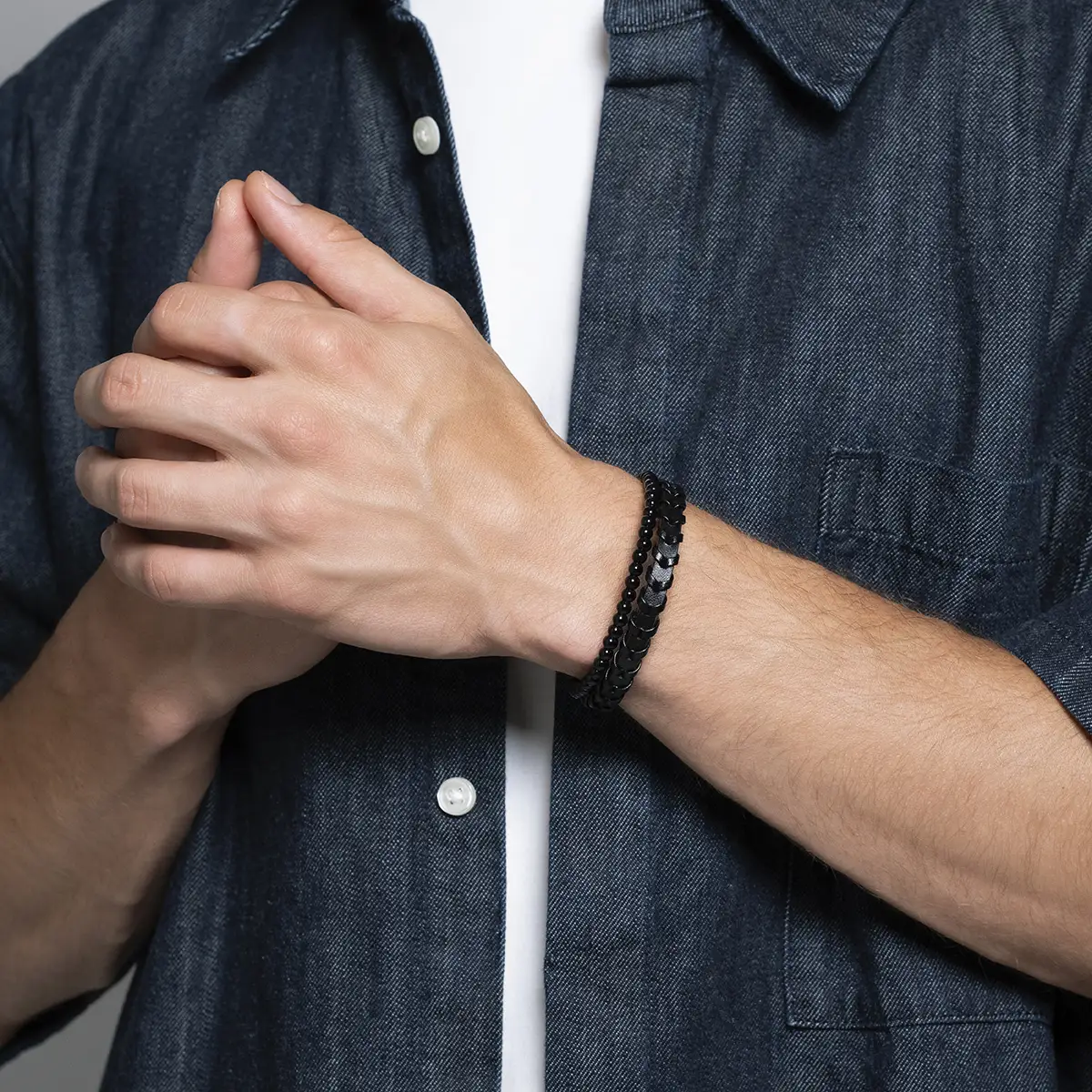 Ce bracelet double rang associe un brin en cuir noir à un second composé de perles d’onyx noires, connues pour leur élégance discrète et leur symbolique de protection. L’alliance du cuir et de la pierre naturelle crée une esthétique masculine à la fois contemporaine et intemporelle.