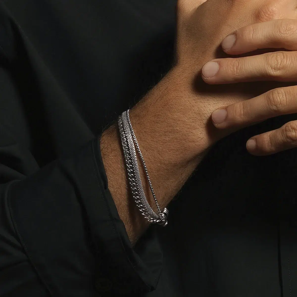 Le bracelet MARIN est un bijou d’exception, pensé pour l’homme qui assume son charisme. Composé de trois chaînes d’acier finement travaillées – une maille vénitienne au design géométrique, une maille anglaise élégante et une maille polonaise au tressage subtil – il joue sur les textures pour un effet saisissant. Son fermoir en acier et caoutchouc, ajustable et ouvragé avec minutie, apporte une finition parfaite. Un bijou puissant, qui évoque la force brute et l’élégance maîtrisée. Offrir le bracelet MARIN, c’est choisir un accessoire intemporel, conçu pour ceux qui ne font aucun compromis sur leur style.