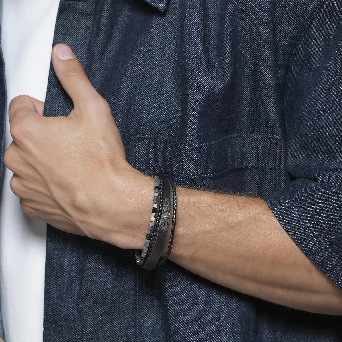 Ce bracelet à quatre rangs associe deux brins de cuir tressé noir, un cuir lisse sobre, et un rang de perles en hématite et onyx aux nuances profondes de noir et gris. Cette alliance de textures et de matières crée un équilibre parfait entre authenticité et modernité.