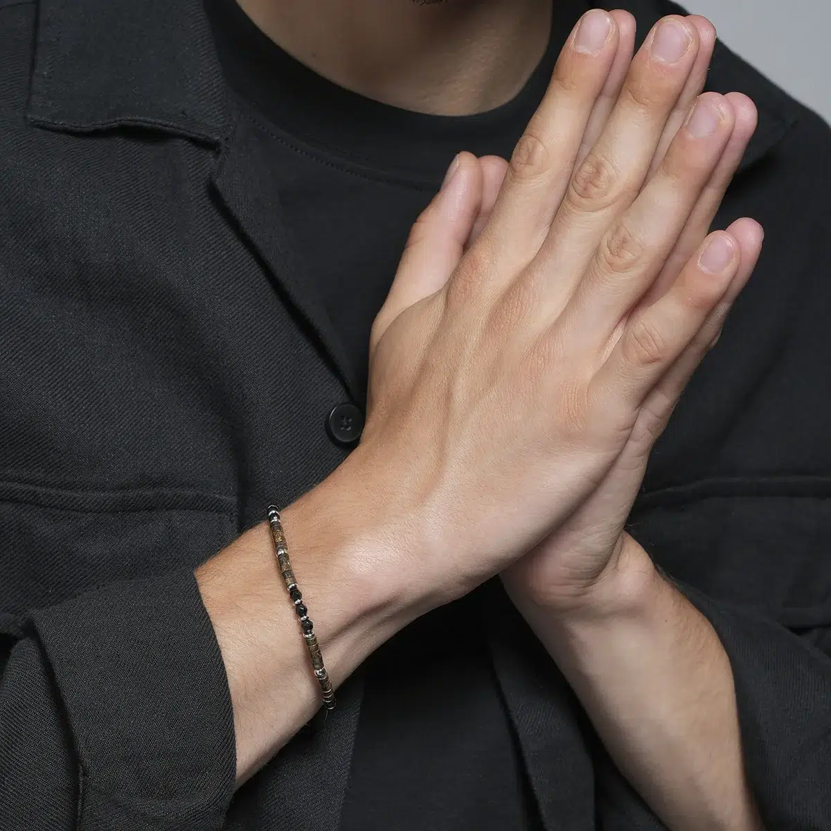 Le bracelet NOVA incarne la rencontre parfaite entre énergie minérale et élégance contemporaine. Composé d’une alternance de perles d’ilménite, de bronzite et d’agate noire, rehaussées par des éléments en acier finement travaillés, ce bijou dévoile un jeu subtil de textures et de reflets profonds.