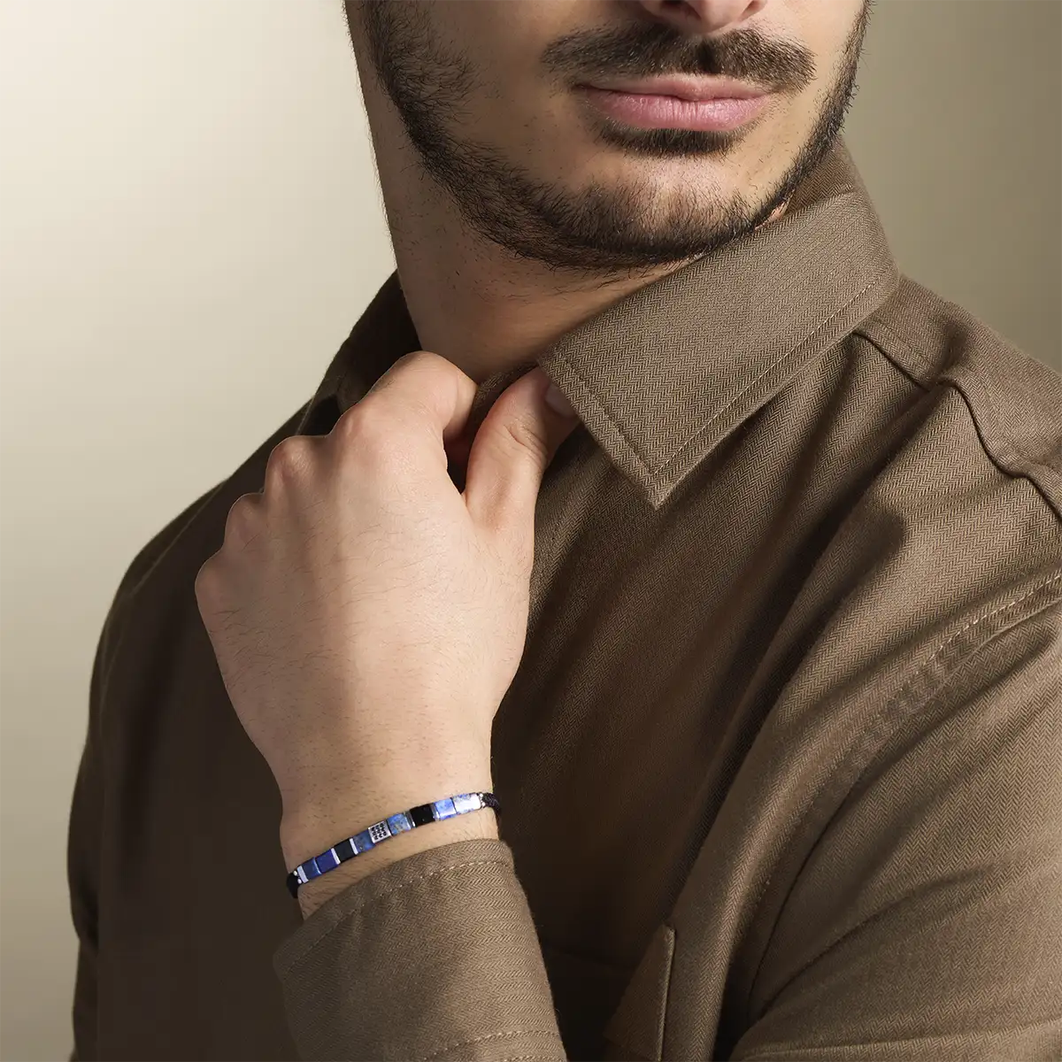 Laissez-vous séduire par l’intensité du bracelet OASIS, un bijou masculin où la puissance des pierres semi-précieuses rencontre l’élégance d’un tressage artisanal. Composé de lapis-lazuli, symbole de sagesse et de confiance, et d’agate noire, pierre d’ancrage et de protection, il dégage une aura profonde et magnétique. Les perles en acier finement travaillées ajoutent une touche contemporaine, renforçant le contraste entre les textures et les couleurs. Ajustable grâce à sa cordelette résistante, le bracelet OASIS s’adapte à chaque poignet avec confort et précision. Un bijou idéal pour l’homme qui recherche une élégance brute et un style affirmé.