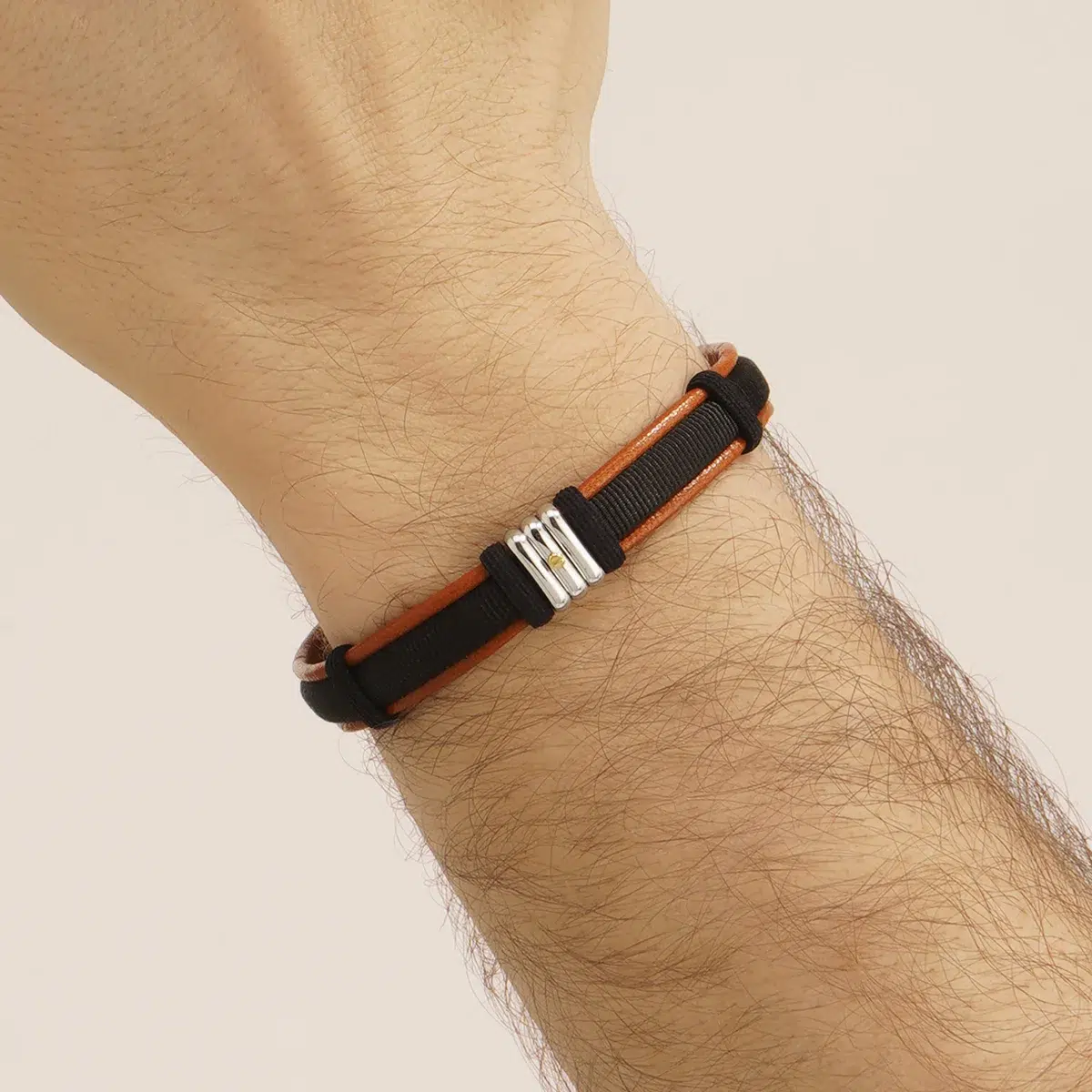 Exprimez toute votre audace avec le bracelet ORSO. Un bijou pour homme qui résulte du mariage raffiné & moderne entre différentes matières : cuir brun, ruban noir texturé et maillons noirs rayés imprimés en 3D. Une perle en acier, ornée d’une vis en or 18 carats, vient élégamment rehausser le tout. Un bijou unique, masculin et sophistiqué, disponible en plusieurs coloris. Offrez-vous ou offrez à un proche cette pièce exceptionnelle !