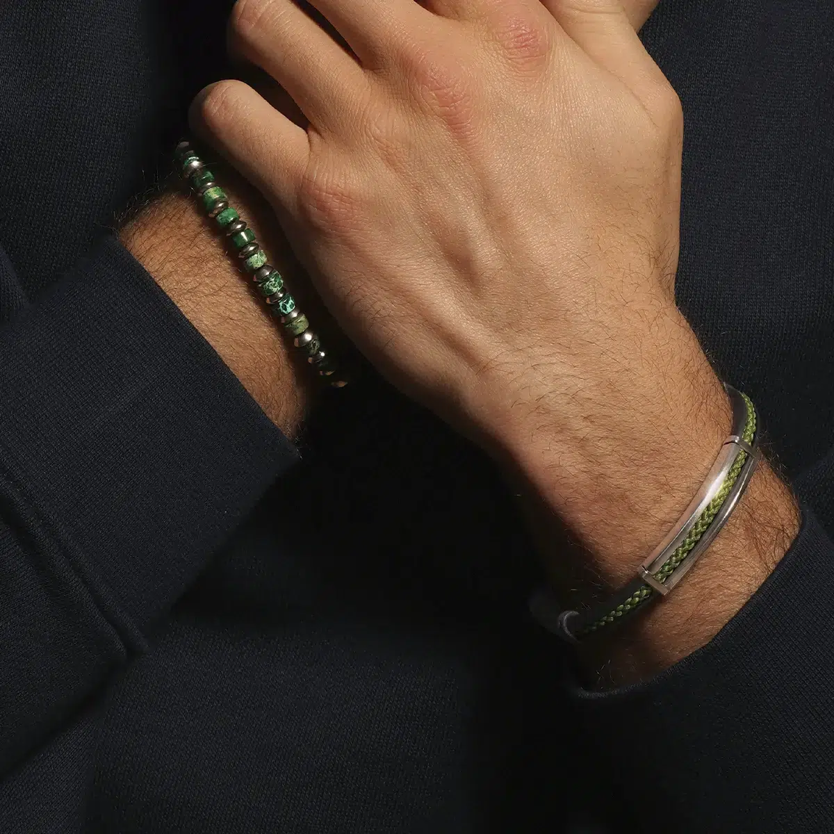 Envie d’une touche d’originalité au poignet ? Découvrez le bracelet SOHAN, un bijou homme unique mariant différentes matières et couleurs ! Conçu en caoutchouc noir, il arbore une cordelette verte, une pièce en acier et des maillons noirs imprimés 3D, en matériau biocompatible. Un incontournable pour un look unique !