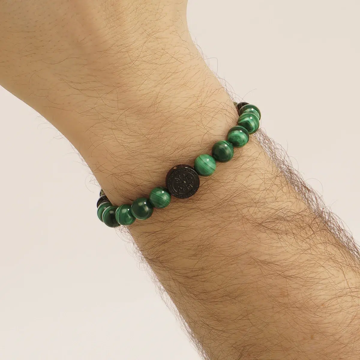 Affirmez votre singularité avec le bracelet YASUR, une création masculine où la puissance de l’acier noir rencontre l’intensité vibrante de la malachite. Les nuances vertes et profondes de cette pierre naturelle apportent une touche de caractère unique, contrastant avec la sobriété mate de l’acier PVD noir.