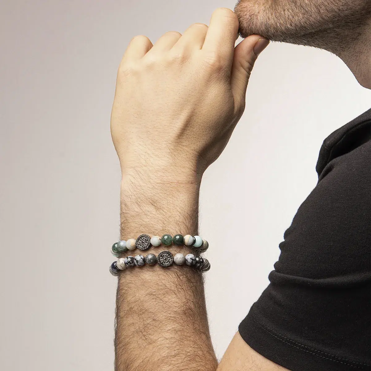 Offrez à votre poignet une expérience chamanique avec le bracelet YASUR en pierres naturelles et acier noir ciselé. Ce bijou masculin en pierre flocon de neige et il de tigre bleu sublimera votre vestiaire avec son rayonnement cosmique.