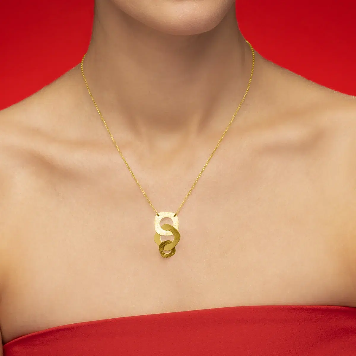 Osez la singularité tout en exprimant votre style avec le collier HÉRA ! Son pendentif réunit trois fines plaques carrées aux coins arrondis en argent doré. Deux sont en argent doré brossé et la troisième présente un aspect lisse et brillant. Un bijou féminin à l’esthétique géométrique douce et contemporaine.