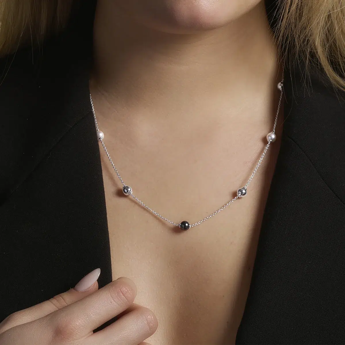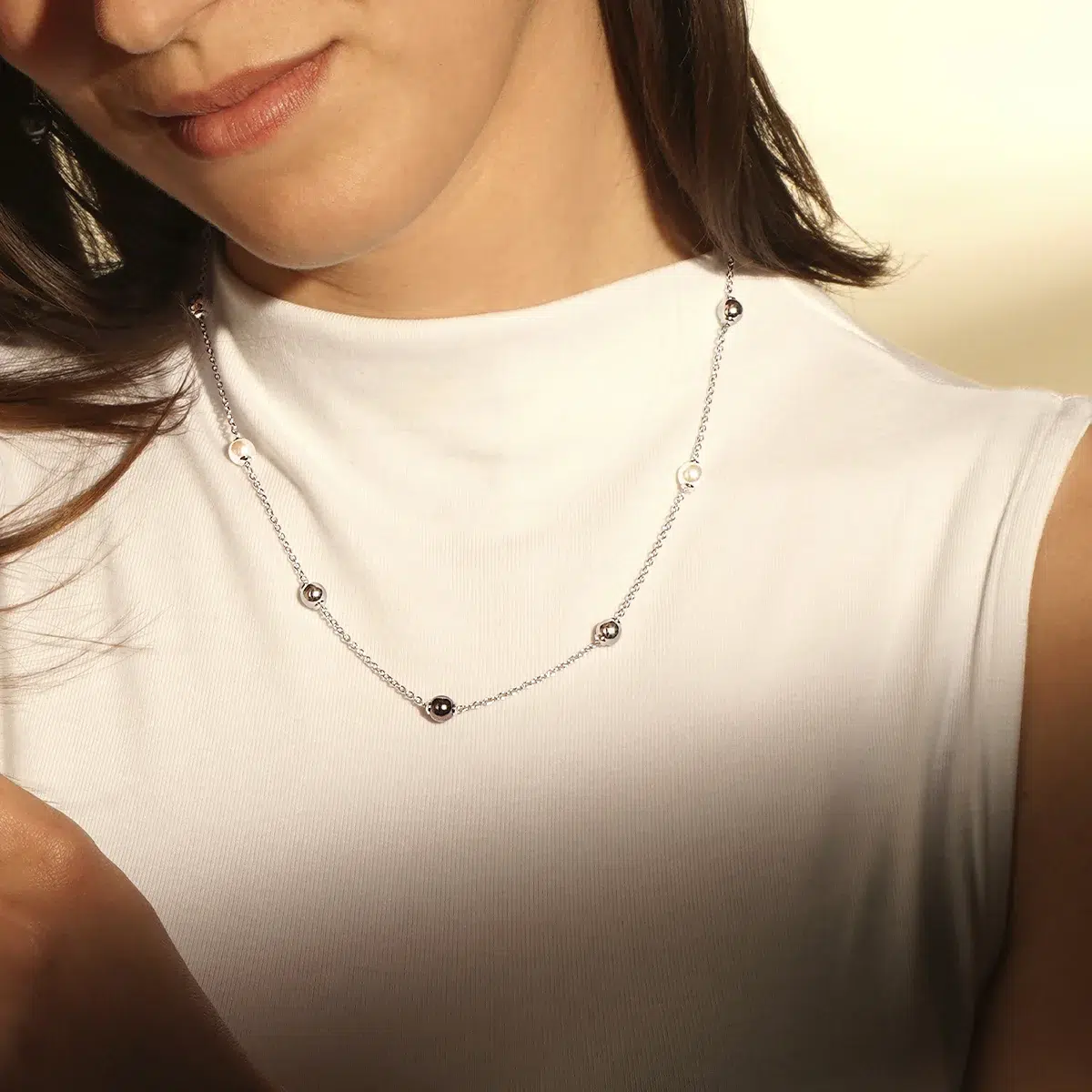 Sublimez votre tenue du jour avec le Collier LIORA en argent 925 et perles naturelles blanches et grises. Découvrez un bijou d’une élégance subtile et intemporelle, au design délicat. Il alterne des perles naturelles aux nuances harmonieuses : le blanc éclatant, le gris nacré et le gris anthracite, qui se marient avec raffinement le long d’une fine chaîne en argent 925.